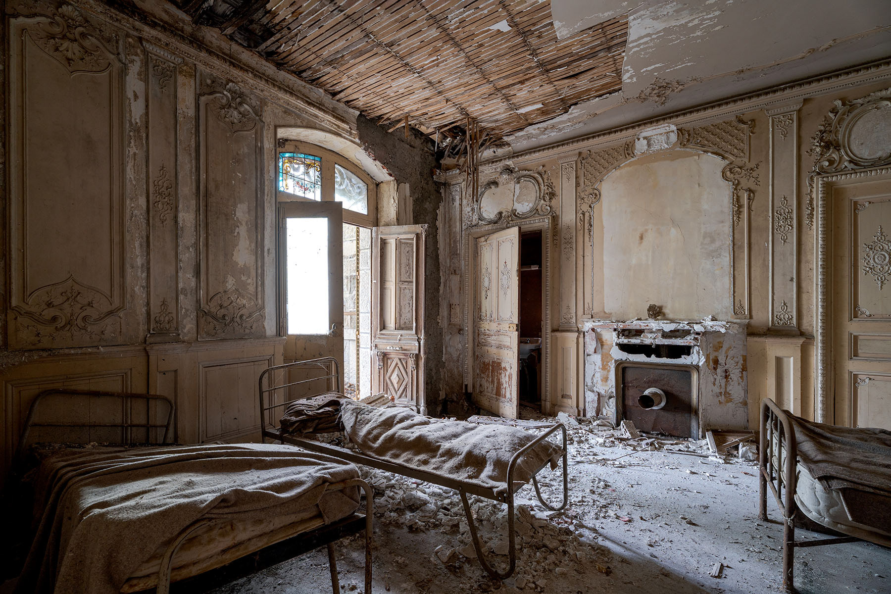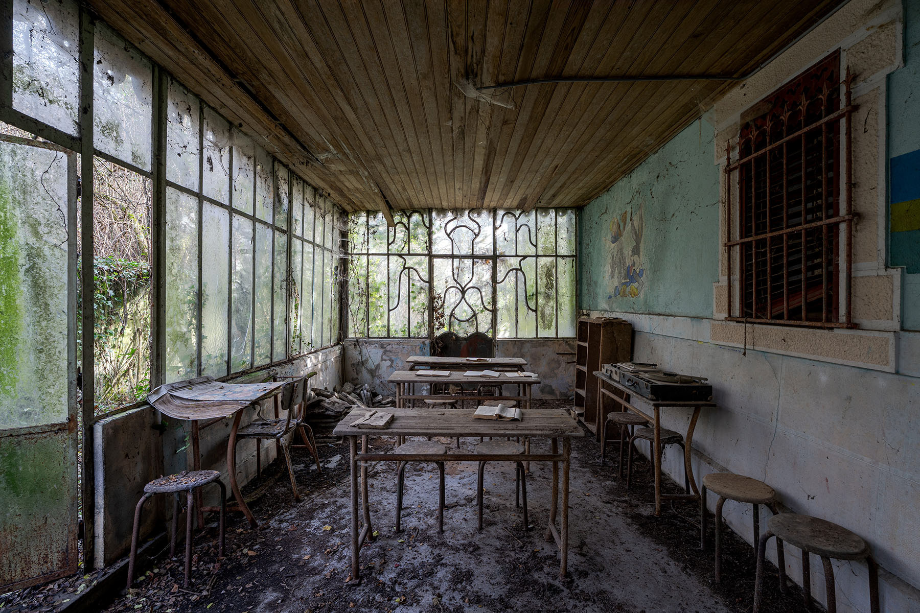 Affiches déchirées, pupitres abandonnés, projecteurs couverts de poussière, gradins envahis par la végétation :